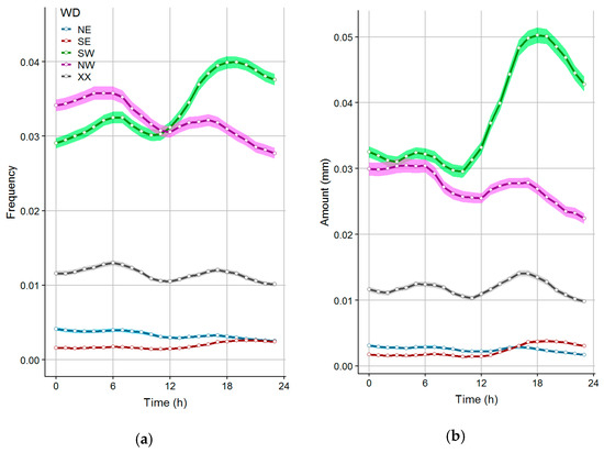 Precipitation diurnal cycle in different wind direction (WD) classes represented by the long-term averages of the hourly precipitation occurrence frequency (a) and the hourly precipitation amount (b) with the shaded 95% confidence intervals.