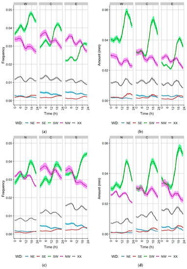 Precipitation diurnal cycle variation in different wind direction (WD) classes and geographical locations represented by the long-term averages of the hourly precipitation occurrence frequency (a,c) and the hourly precipitation amount (b,d) with the shaded 95% confidence intervals. The colors represent the four WD classes, while the panels represent the station class by latitude (a,b) and longitude (c,d).