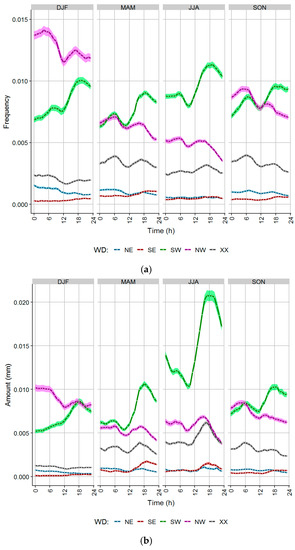 Seasons seem to have more influence on the PDC patterns than geographical location. The frequency and the amount of summer precipitation are the largest for the SW (Figure 10), while in winter, the NW records the highest rain frequency and amount. A higher peak for the SW (NW) in the afternoon (morning) prevails in all seasons. The morning peak in the precipitation frequency occurs at the same time for the SW and NW in all seasons, except for winter, where the SW morning peak appears a few hours later. The morning peaks in the precipitation amount differ by season and WD class. It is clear for spring and fall in SW and NW, has a weak magnitude in summer, and disappears in winter. Only in the case of the NW is the precipitation amount high from the early morning until 06:00, then it starts to drop.