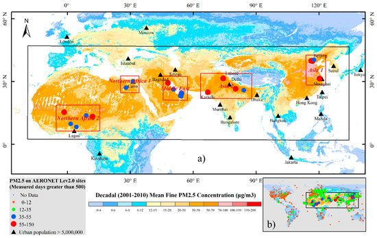 The AERONET (AERosol RObotic NETwork) is a worldwide network of ground stations equipped with well-calibrated Sun photometers to assess aerosol optical properties, such as their optical depth [18]. It provides a dataset of spectral AOD in the range of 0.340–1.060 µm with low uncertainty (~0.01–0.02) and high temporal resolution (every 15 min) under cloud-free conditions [29]. AERONET observations have been widely adopted for the validation of satellite-retrieved AOD [28,30,31]. For the validation of MODIS aerosol products over the heavy aerosol loading area, this study used the version 3 cloud-screened and quality-controlled level 2.0 AOD ground-based observations from 23 AERONET sites during 2000 to 2016, as shown in Figure 1, which are located in regions above the annual average WHO IT-1 value for PM2.5 of 35 μg/m3, and with at least 500 days of measurements. Figure 1 shows global decadal mean satellite-derived PM2.5; this data set was inspired by work by van Donkelaar et al. [32]. PM2.5 concentrations in large populated regions of northern India and eastern China, respectively, exceed 60 μg/m3 and 80 μg/m3. The summarized information of all collected sites is shown in Table 1.