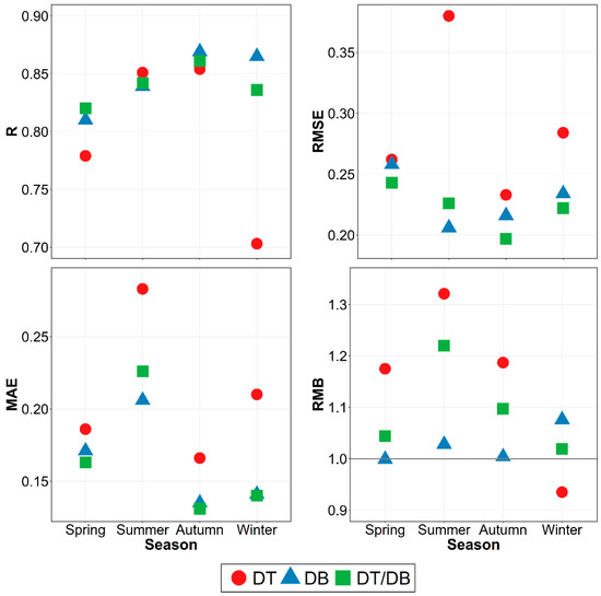 Error statistics for DT, DB, and DT/DB products against AERONET AOD ground-observed measurements in the four seasons.
