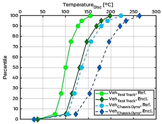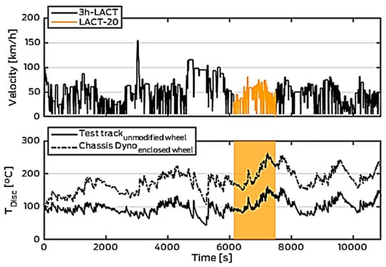 Brake temperatures appear to have large influence on PN emissions [,,]. Figure 3 compares brake disc temperatures recorded with sliding thermocouples during the 3h-LACT at the chassis dynamometer and on the test track. Test track data originates from a previous study with identical vehicles, measurement setup, and brake material [].