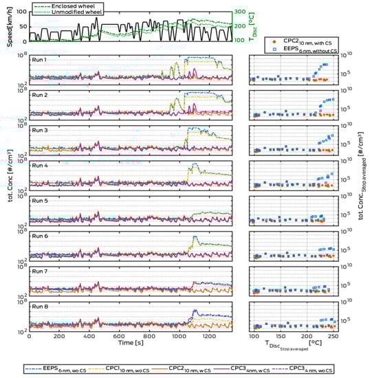 Figure 4 gives an overview of all eight runs of the LACT-20 driven in consecutive order on a single day. The start condition for each run was a disc temperature of 100 °C measured at the enclosed wheel. During runs one to six, CPC34nm measured with CS while in runs seven and eight without CS. All of the shown PN traces are at the same level for the first 800 s of the test cycle for all the repeats and regardless the presence or not of the CS. The slightly higher traces measured with EEPS1 during the first 800 s are attributed to the background noise of the instrument electrometers. Background concentration measured by EEPS with running blower was low with small variations among the 8 runs (3.5·103 #/cm3 ± 0.9·103 #/cm3). Due to its measurement principle, the EEPS is generally less sensitive than a CPC for low particle concentrations []. Furthermore, electrical mobility spectrometers are known to under- or over-estimate concentrations depending on particle size, morphology, and presence of agglomerates [,]. After approximately 800 s the solid (CS) and total (without CS) particle number traces deviate from each other.