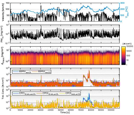 Following the repeatability measurements, two runs of the 3h-LACT were driven on a single day on the chassis dynamometer. In contrast to the setup presented in Figure 1, both EEPS devices were operated without CS. The setup change was made since no signal above background concentration was found for the EEPS post-CS in the preceding tests. Figure 6 shows the time trace of the second 3h-LACT run.
