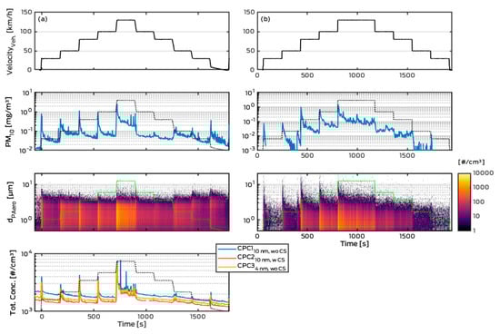 We conclude that these particles are actually generated at the brakes. First, it is unlikely that these events are only a measurement artefact since they are observed simultaneously by all particle measurement devices which are each based on different measurement principles. Secondly, as shown by Farwick zum Hagen et al. [], the enclosed measurement setup shields contamination from other potential sources very effectively, i.e., a background contribution. It is mentioned that particles coming from the tire/road interface comprise less than 8% of total particles. Thirdly, running the pyramid cycle on a brake dynamometer in absence of any tires led to comparable results as shown in Figure 7b [].