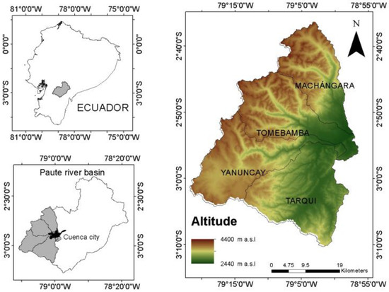 The study area includes four sub-basins, e.g., Machángara, Tomebamba, Yanuncay, and Tarqui, in the upper part of the Paute river basin (1602 km2), located in the southern Ecuadorian Andes (Figure 1). This region is essential to the water supply for the city of Cuenca, which is the third most important city in Ecuador [68] with a population of 660,000 inhabitants. The altitude in the study area varies between 2440 and 4400 m above sea level. The upper and middle parts of the basins are covered by patches of Polylepis reticulata, tussock grasses, ground rosettes, cushion plants, and ground rosettes, and the lower part of the basins is covered by pastures, agricultural lands, and urban areas [58,69,70]. According to [71], the study area has two precipitation types: Bimodal type II corresponding to upper and middle part of the basins, and Bimodal type I in the lower part; both of these presented rainfall peaks in April and October; however, Bimodal type II presented a lesser pronounced dry season in June–August, with important anomalies in July due to the intensification of the easterlies and the eastward orientation of the western part of the Paute basin, producing enhanced orographic precipitation [72].