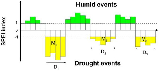Following [90], values less or equal to −1 of drought occurrence were assumed for SPEI3 (Figure 2). The threshold level is based on the run-length concept and frequency analysis. Three parameters were used to characterize the drought time series: