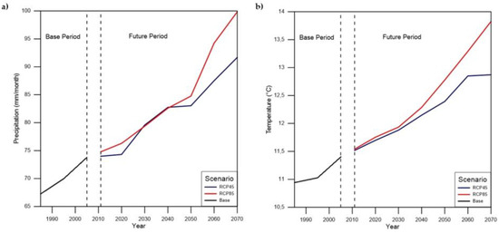 The analysis of the variation of temperature and precipitation over time was made with the average values in the base period (1981–2005) and two future periods (2011–2040 and 2041–2070). The comparison was made with maps of the base period and future periods, using the average value pixel-wise in each period. The comparison between periods was made with the statistical stability over time of the data, and, thus, tests of stationarity were made to the base period [81,82,83].