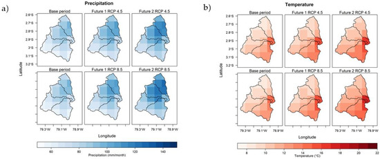 Figure 4a shows the maps of precipitation changes in the study area. Spatially the precipitation increases from one period to another (Base period: 1981–2005, Future period 1: 2011–2040, Future period 2: 2041–2070). The precipitation for the scenario RCP 8.5 is higher than precipitation for the scenario RCP 4.5. Besides, during Future 2 more precipitation is expected, especially in the Machángara and Tomebamba rivers sub-basins. Regarding temperature variations, Figure 4b displays that the temperature increases slightly from period to period, and the scenario RCP 8.5 shows more increment than scenario RCP 4.5.