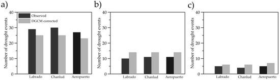 The comparison of moderate, severe, and extreme droughts frequencies between DGCM corrected data and the observed data of the three meteorological stations is shown in Figure 5. This figure indicates that the frequencies are very similar; therefore, the DGCM corrected data was used for the space-time analysis of droughts in the future.