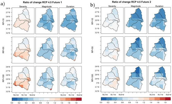 Figure 7 shows the ratio of change for magnitude, duration, and severity under the RCP 8.5 climate scenario (for both futures). On the one hand, Figure 7a,b show again that the magnitude and duration have a sharp decrease relative to the base period. Interestingly, the rate of change for magnitudes and durations seems to be smaller for larger return-periods. The last is a clear symptom that the probability function of extremes changes its magnitudes and shapes in different climate scenarios (i.e., tail-shapes). As a consequence, interpolations and extrapolations have different trends for any return-period. On the other hand, the severity switches its behavior from a decreasing to increasing pattern—from the first to the second period. This is the opposite of the effect shown in the RCP 4.5 scenario; but it is probably a response to the interactions between quantities and frequencies of precipitation events, as explained before. The contrasting effect on the severity switching for both scenarios could be considered counterintuitive at first glance, keeping in mind that for the RCP 8.5 a hypothetical increment of greenhouse-gas is permanent (which is a rather different hypothesis than the one made for the RCP 4.5) [102]. Nonetheless, these differences in severity switching would mean that, although magnitudes and durations have similar decreasing patterns for both scenarios, the interactions between them (explaining the differences in severities) are rather different. Furthermore, these severity switching differences could encode other more complex climate interactions between the drought variables and other climate variables.