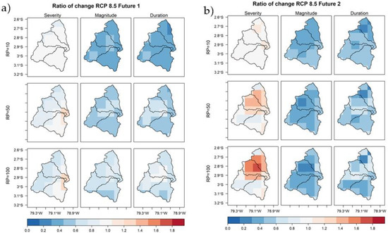 Ratio change of drought features of scenario RCP 8.5 with respect to the base period (1981–2005): (a) Future 1 (2011–2040) and (b) Future 2 (2041–2070).