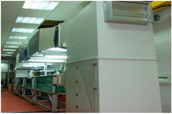The wind-wave flume in Water Waves Laboratory, Tel-Aviv University (TAU) described in detail in Liberzon and Shemer [51] consists of a closed-loop wind tunnel installed atop of a test section that is 5 m long, 0.4 m wide, and 0.5 m high (see Figure 1). It was designed and constructed with the purpose to enable measurements at any desired location along the test section by a variety of sensors and experimental methods. A computer-controlled blower enables the maximum wind speed in the test section, which may exceed 15 m/s. The rectangular air inlet and outlet openings in the tank are 0.4 m wide and 0.25 m high. The wind tunnel is equipped with 1 m3 settling chambers at the inlet and the exit of the test section; a 5-cm thick honeycomb with 5-mm hexagon cells and a converging nozzle with an area reduction ratio of about 4 at the inlet assure uniform airflow in the test section. Sidewalls and the bottom of the wave tank are made of clear glass to enable flow visualization of the wave field from all directions. Transparent removable Perspex plates with a partially sealed slot along the centerline of the test section to facilitate inserting the sensors serve as the tank’s roof. An instrument carriage built of aluminum profiles that is movable along the test section can be positioned at any fetch. When necessary for imaging purposes, the Perspex plates at the imaged fetch are replaced by a clear glass sheet to minimize optical disturbances. The water depth in the test section is maintained at about 0.2 m, satisfying the deep-water conditions for the wind-wave lengths observed in this study; a flexible 40-cm long flap connects the bottom of the wind tunnel’s converging nozzle to the test section slightly above the mean water level height to ensure smooth airflow.