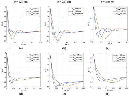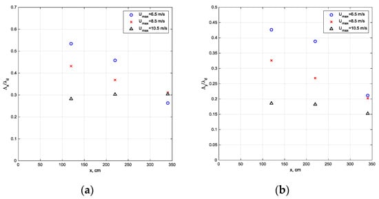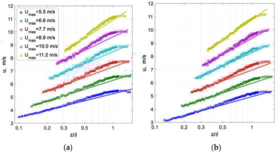 The mean velocity distributions for two representative fetches (x = 260 cm and x = 240 cm) are presented in Figure 2. Additional experimental data on the vertical air velocity profiles can be found in [51,53]. Coles [70] showed that for solid stationary surfaces, starting from (approximately about 20% of the turbulent boundary layer thickness), the profile is no longer of logarithmic form, and is affected by the flow in the outer (‘wake’) layer. Thus, the boundary layer thickness over the mean water surface δ (taken here as the elevation where the mean velocity attains 99% of its maximum value) was chosen in Figure 2 as a parameter to normalize the elevation over the mean water surface. The values of δ range from about 50 mm at shorter fetches to about 80–90 mm at x = 340 cm; the variation of δ with wind velocity at each fetch is insignificant. The advantage offered by the automatic experimental procedure made possible air velocity measurements at about 100 vertical positions. For lower wind velocities and thus lower wave crests, measurements were performed quite close to the water surface. Since waves grow with the fetch x and with the wind velocity Umax, the lowest measuring location had to be shifted upward (relative to the mean water level) accordingly. It is possible to distinguish in the profiles plotted in Figure 2 between two regions. The lower part of each profile, up to about 0.4δ, i.e., for maximum elevations not exceeding about 15 mm for lower fetches to about 30 mm at the far end of the test section, is linearly fitted and exhibits logarithmic velocity distribution, while above this region, deviation from the fit can be noticed [70,71]. When the log fit is performed on the whole set of data that extends to the outer part of the boundary layer, the resulting slope of the line is somewhat different, and the values of and z0 resulting from such a fit are less accurate. The logarithmic fit curves for a given Umax at panels in Figure 2 have similar slopes. The same observation holds for additional fetches, as shown in [53]. In view of Equation (4), this indicates that the friction velocity does not vary notably with fetch. The vertical shift of the profiles with x and with Umax implies that the effective surface roughness z0 in the present experiments generally increases with fetch and with the wind velocity.