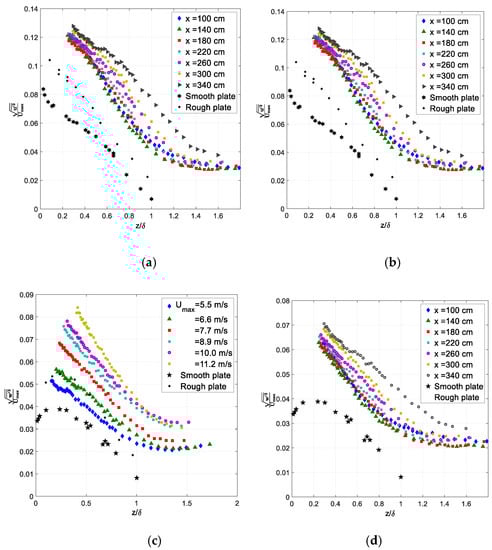 The vertical profiles of the root mean square (RMS) values of the deviations of the instantaneous velocity components from the local mean values in both longitudinal (u′) and vertical (w′) directions measured with an X-type hot-film anemometer are presented in Figure 3. The effect of the wind velocity in the test section represented by Umax is studied in panels (a) and (c) for a fixed fetch x = 300 cm. In Figure 3b,d, the profiles of the normalized by Umax RMS values of two components of the turbulent fluctuations are plotted for various fetches, and a constant value of Umax = 7.7 m/s are plotted. Those results are related to the classical measurements of turbulent flow over a solid surface in Figure 3a,c. Here, the corresponding vertical profiles of turbulent velocity fluctuations measured in turbulent boundary layer over a smooth plate by Klebanoff [72] and over a rough plate by Corrsin and Kistler [73] (see also Hinze [74]) are presented as well; those measurements were performed at comparable free stream air velocities.