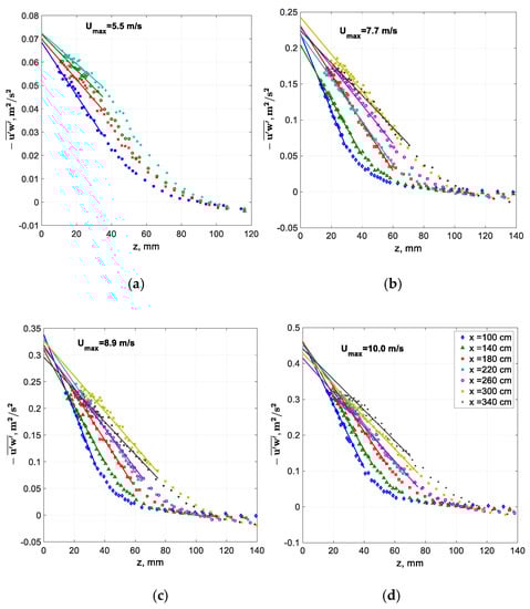 Measurements of the Reynolds shear stresses allow the direct evaluation of the friction velocity (the so-called eddy correlation method). The measured variation of the Reynolds shear stress with height is presented in Figure 4 for four wind velocities Umax; additional data can be found in [53]. The vertical profiles of the Reynolds stress are affected by the mean pressure gradient [52]. The pressure drop over the test section is quite modest, ranging from a few Pascals for low flow rates to about 20 Pa for Umax ≈ 9 m/s. The Reynolds shear stresses within the boundary layer vary linearly with elevation for all wind flow rates and fetches, vanishing in the central part of the test section, and changing sign with approach to the roof of the channel. The data points within the boundary layer were linearly fitted, with fits extrapolated to the mean water level z = 0. The limiting value of the Reynolds shear stress at z = 0 can be seen as the squared value of the friction velocity (the so-called eddy correlation method). The very limited scatter of the limiting values of extrapolated to z = 0 in each frame of Figure 4 indicates that the values of the friction velocity measured by the eddy correlation method in the present experiments are practically independent of fetch. However, the interfacial shear stress increases notably with the wind velocity.