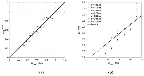 The eddy correlation method for the determination of the shear stress is considered more reliable as compared to determination of from the velocity profiles, as presented in Figure 2 and in the application of Equation (4), since the Reynolds stress is measured directly. However, thermal anemometry is more complicated and time consuming; thus, the measurements in [53] were carried out for a limited set of parameters. To validate the accuracy of both approaches, the friction velocities estimated from the logarithmic fit of mean velocity profiles and the values derived by application of the eddy correlation method are compared in Figure 5a for all fetches and wind flow rates.
