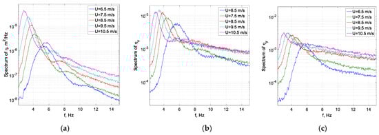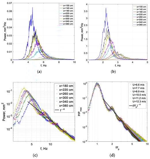 The surface elevation power spectra are now examined in greater detail in Figure 6c,d. In Figure 6c, the spectra obtained at several selected fetches at a constant air flow rate are plotted in a logarithmic scale as a function of the dimensional frequency, whereas in Figure 6d, the power spectra are normalized by their peak values and plotted for several wind velocities as a function of f/fp. The lines corresponding to the power law: