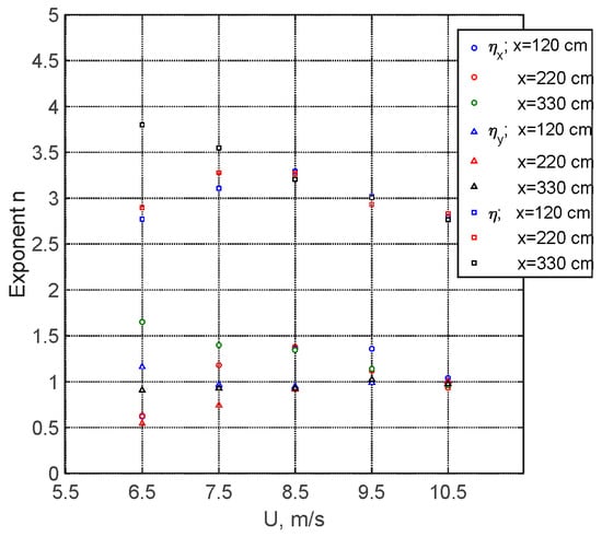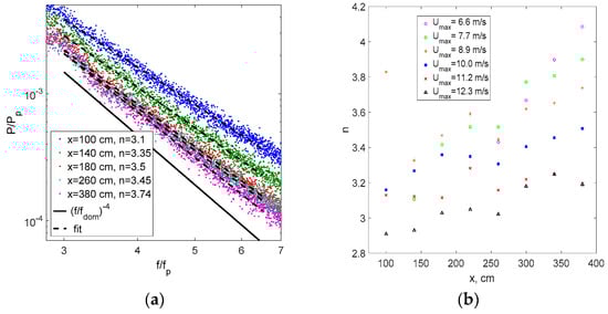 The tail behavior is only in qualitative agreement with that corresponding to n = 4; a notable spread of the tail slope is clearly visible in Figure 6d. Therefore, a closer look at the power-law dependence on the frequency of the high-frequency ‘tail’ of the spectra is presented in Figure 7a. The linear fit range 3 < f/fp < 6 was chosen in this figure, as the spectra in this part are free of noticeable higher harmonic peaks, which can affect the slope. The power n that defines the exponent in the power law shown in Equation (6) is defined by the slope of the fit. The values of n are usually somewhat above n = 3 and remain mostly below n = 4; they decrease with wind velocity and have a tendency to increase with fetch. At the largest wind velocity, the measured value of n is the lowest, and is close to the theoretical prediction of n = 17/6, which equals approximately 2.83, for purely capillary waves [76], it increases with fetch from n = 3.1 for x = 100 cm to n = 3.74 for the longest fetch, x = 380 cm.
