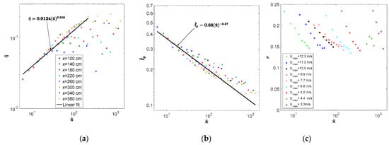 In view of the relations shown in Equations (1) and (2), the characteristic amplitude and the peak frequency can be presented in dimensionless form as and , where the dimensionless fetch = . Note that for a given dimensional distance from the inlet x, the dimensionless fetch decreases with , and thus with the increased airflow rate in the tank. The dependencies of the dimensionless amplitudes and dimensionless peak frequencies on the dimensionless fetch are plotted in Figure 8a,b.