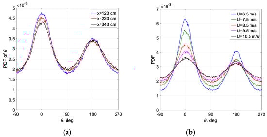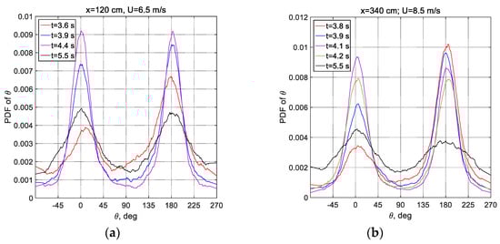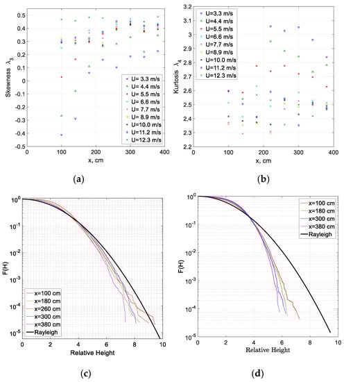 The exceedance distributions obtained in the present experiments are compared in Figure 9c,d with the Rayleigh distribution. Each individual wave height was calculated as the difference between the maximum and minimum between two consecutive positive zero crossings. Note that the statistics in those panels is based on ensembles that contain more than 104 individual waves. For all experimental conditions, notable deviations from the Rayleigh distribution are indeed clearly visible in those panels. For the Rayleigh distribution, the significant wave height Hs ≈ 4. The probability of small and moderate waves with heights H < Hs, is higher in Figure 9c,d than that corresponding to the Rayleigh distribution. However, the probability of waves higher than Hs is overestimated by Equation (10). These deviations from the Rayleigh distribution are stronger for the higher wind velocity in Figure 9d as compared to the weaker wind case in Figure 9c. No dependence of the measured F(H) on fetch can be clearly identified in those panels. Few extreme waves recorded at the low wind flow rate in Figure 9c appear exclusively at short fetches characterized by vanishing wave heights. Extremely steep (the so-called freak) waves are usually defined as waves with heights exceeding 2Hs or 8. Thus, it follows from the present results that the probability of such waves is considerably overestimated by the Rayleigh distribution; those waves are totally absent in all ensembles accumulated at the high wind velocity, as shown in Figure 9d.