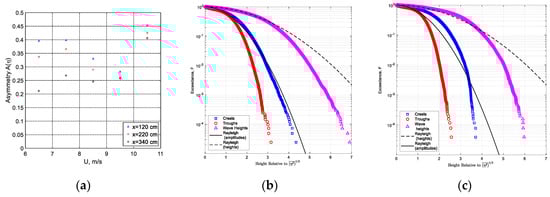 In addition to wave heights, the exceedance of probability distributions for crest heights and trough depths were also computed in [88]. The crest and trough parameters were calculated as local maxima and local minima between two consecutive positive zero crossings. In those experiments, the total sampling duration was about 3 h at each fetch and wind velocity, allowing to record ensembles containing the number of individual waves (0.3–0.8 × 105) that are even larger than those used for computing statistics in Figure 9. Therefore, probability distribution tails could be accurately estimated.