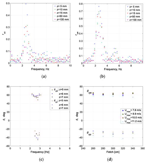 Characterization of wave-coherent air velocity fluctuations. (a) Cross-correlation coefficients rηu at various elevations z above the highest crest at x = 260 cm and Umax = 11.2 m/s; (b) as in (a) for rηw, x = 340 cm and Umax = 11.2 m/s; (c) Phase shifts θηu and θηw in the vicinity of the peak frequency at x = 260 cm and Umax = 11.2 m/s; (d) Phase shifts between the two velocity components and the surface elevation at the peak wind-wave frequency for various fetches and wind velocities.