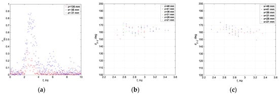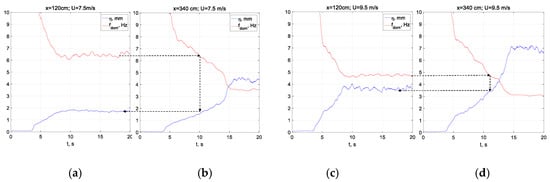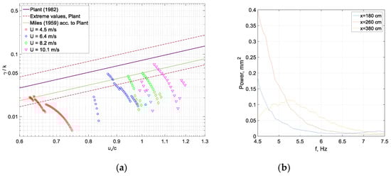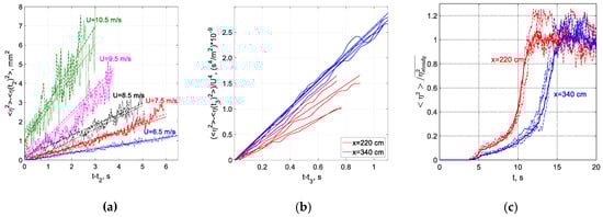 Similar results were obtained in field measurements by the JONSWAP group [79] and by Kahma [80]. The points in Figure 6a,b that do not fit the general trend and are marked by filled symbols correspond to lower wind velocities and thus higher dimensionless fetches . The peak frequencies at lower wind velocities mostly exceed 5 Hz at all fetches; the frequencies of the corresponding short waves are strongly affected by Doppler shift due to the surface drift current [51]. The effect of the drift current that is mostly pronounced at low airflow rates seems to cause the deviation from the power law of the energy growth and peak frequency variation along the test section; therefore, these values were not included in the data fits in Figure 6. The relation between the dimensionless wave amplitude and peak frequency can be obtained from the linear fits in Figure 6: