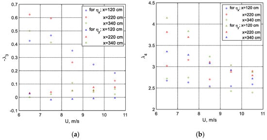 for normally distributed random variables, λ3 = 0 and λ4 = 3. The values of λ3 and λ4 calculated from the measured data for all cases are plotted in Figure 9a,b.