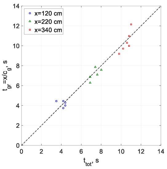 where σ is the water–air surface tension. The shear current close to the water surface can affect the dispersion relation due to the Doppler shift. To evaluate this effect, the wave phase velocity (celerity) of short waves, c = ω/k, was measured directly using two consecutive probes, thus allowing determining the wave number from independently measured wave celerities and frequencies. Each frequency component of the spectrum was examined separately. The celerity for each frequency for which the cross-correlation between the two gauge outputs was sufficiently high was determined by calculating the complex cross-spectrum of the two wave gauges’ output. The ensemble of measured values of c determined at the local peak frequency fp at numerous fetches and wind flow rates was compared to the celerities of the corresponding gravity–capillary waves calculated based on Equation (14), cgc. The obtained results were fitted to an empirical dispersion relation of the form: