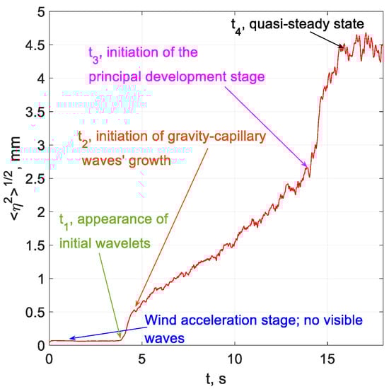The unsteadiness of wind forcing and the resulting inhomogeneity of wind waves introduces additional complexity to the problem of excitation of water waves by wind. Larson and Wright [41] applied radar to measure initial growth rates of gravity–capillary waves following impulsively applied wind forcing, while Plant and Wright [42] investigated the temporal and spatial evolution of waves propagating in along-wind and counter-wind directions. Kawai [28] investigated the initial wavelets that appear after the abrupt start of the wind over a still water surface both experimentally and by applying linear theoretical analysis. The exponential growth of wave harmonics in time was also reported by Mitsuyasu and Rikiishi [43], who studied the evolution of the wind-wave field in a laboratory tank under a rapidly accelerating wind. The quasi-steady analysis of short segments was applied in this work, as well as in the study of the effect of wind gusts on the developed wind-wave field [44]. Veron and Melville [45] applied a number of sensors to study waves driven by accelerating wind. Uz et al. [46,47] investigated the wave field in a tank under steady, abruptly starting and modulated wind speeds. A range of wavelengths was investigated using a scanning laser slope gauge. Hwang and Wang [12] and Hwang et al. [48] reported on field experiments under unsteady forcing and suggested appropriate space–time conversion to relate fetch and duration-limited results.