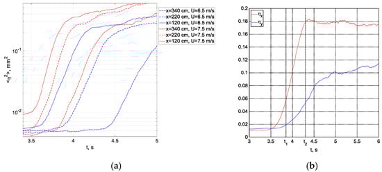 Benjamin [22] and Miles [23,24,25,26] updated the critical layer model, in particular to incorporate the wave-induced perturbations of the Reynolds stresses. However, Miles [25] stressed that the model remains unreliable at the initial stages of wind-wave generation. Valenzuela [27] and Kawai [28] generalized the deterministic Miles’ approach and considered the problem of linear stability of coupled viscous shear flow at the gas–liquid interface that is described by the fourth-order Orr–Sommerfeld equation. Both inviscid and viscous linear theories predict the exponential growth of an initially infinitesimal wave with time.