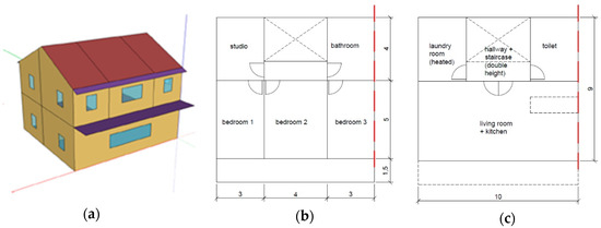 The model consisted of nine thermal zones, one for each room (Figure 1) and one for the staircase. The living area is located on the ground floor while the sleeping area on the first floor. The building has a net floor area of 124 m2 and a floor-to-ceiling height of 2.7 m. The west façade was assumed to be adjacent to another similar building; thus, it was considered as adiabatic.