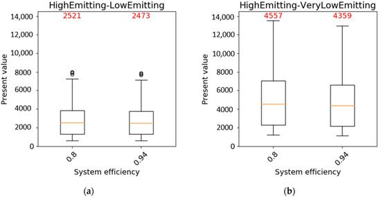 Present values in Euros calculated with different heating system efficiency values: 0.80 indicates a less efficient system (e.g., traditional non-condensing boiler) while 0.94 a very efficient heating system (e.g., condensing boiler and state-of-the-art set-up). The red numbers indicate the median value. (a) Scenario HE − LE. (b) Scenario HE − VLE. High-emitting (HE), low-emitting (LE).