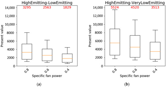 The specific fan power has a higher impact on the present value calculation compared to the heating system efficiency. As shown in Figure 3, more efficient fans lead to a 22% to 44% reduction in the median present value in the HE − LE scenario, and a 18% to 36% reduction in the HE − VLE scenario. In the latter, the percentage values are slightly lower, but the absolute difference is higher as the median values are higher. In general, the reasons for this higher impact are the fact that the difference between the three levels of specific fan power are proportionately wider than the difference between the efficiency levels used for the heating system, and the more elevated cost of electricity compared to gas.