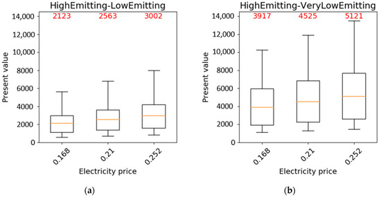 Similarly, the present value is considerably less sensitive to variations (±20% variation in both cases) in the gas price (Figure 4) than in the electricity price (Figure 5) due to the fact that electricity is more expensive. For electricity, an increase in the unit price makes the median present value higher, but the distribution of the values also spreads, as shown by the increasing vertical dimension of the boxes (Figure 5) that encloses the values between the 25th and 75th percentiles for each distribution.