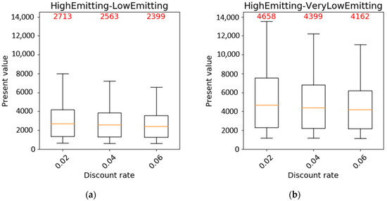 Present values calculated with different discount rates. (a) Scenario HE − LE. (b) Scenario HE − VLE.