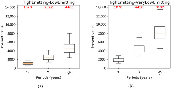 Lastly, Figure 7 highlights how the selection of a certain number of years is the most critical parameter. In the HE − LE scenario, the increase from 2 to 5 years leads to a median PV that is nearly 2.5 times higher (233% increase) while when considering 10 years, the PV becomes over 4 times higher (416%). A similar trend also happens in the HE − VLE scenario, although in this case, the absolute figures are more elevated. In both scenarios, the vertical dimension of the boxes (that shows how widely the values between the 25th and 75th percentile are spread) also grows with the number of years as the effect of the variations in the other parameters becomes increasingly relevant as more terms (i.e., annual cashflows) are added together.