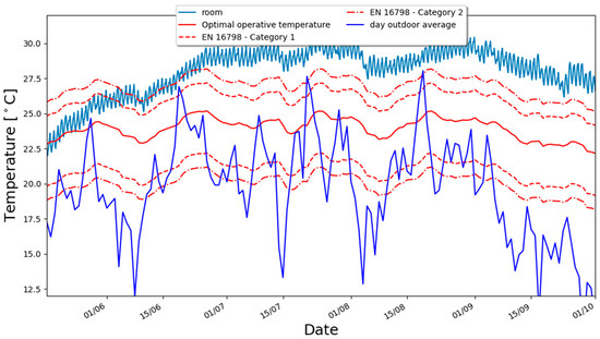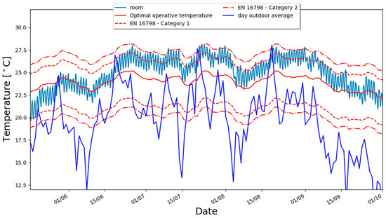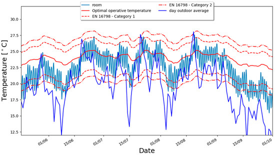 Figure 8, Figure 9 and Figure 10 show the temperature inside the living room in the three different configurations during the non-heating period, the outdoor temperature, and the temperature limits of category 1 and 2 of the standard EN16798:1 [17]. The closer the room temperature is to the optimal operative temperature, the higher the thermal comfort level is likely to be. For a residential building, the target limits suggested by the EN16798:1 are the category 2 limits.