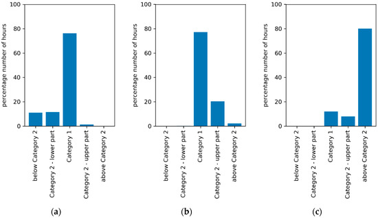 Distribution of the hours from 15 May to 30 September in the EN16798:1 categories for the three configurations: (a) high emitting, (b) low emitting, and (c) very low emitting.