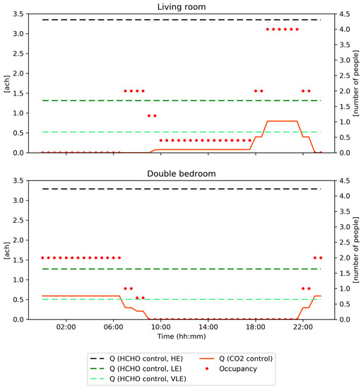 In both standards and current practice, ventilation systems are sized and controlled on the basis of the CO2 concentration as the main indicator of all human-generated bio-effluents and indoor pollutants related to occupancy. However, this is very unlikely to be sufficient in several situations in which there are other pollutants not related to occupancy, such as formaldehyde. Figure 12 compares the ventilation rates needed to control the contaminant in the three building typologies (HE, LE, VLE), respectively, for the living room and the double bedroom. To keep the formaldehyde concentration below the guideline value, for the living room, 3.4 ach for HE, 1.3 ach for LE, and 0.5 ach for VLE are required, respectively, while lower and variable ventilation rates are needed to keep the CO2 concentration within the room below the guideline value. CO2-based ventilation rate requirements are zero or very low ventilation rates until 6 pm, where the living room’s occupancy is low, and reaches a maximum value of 0.8 ach when the room is occupied by four people. A similar behavior can be observed for the double bedroom. In this case, the air changes required to control the formaldehyde are 3.3 (HE), 1.3 (LE), and 0.5 ach (VLE) while the one needed to dilute the CO2 is lower due to the lower occupancy of the bedroom, and reaches a peak value of 0.6 ach when the room is occupied by two people. This gives evidence of the fact that the design and control of the ventilation rate based on the CO2 concentration only is usually not enough to guarantee a good air quality if other dominant pollutants, such as the formaldehyde, are present.