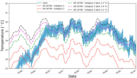 A complementary solution to improve the thermal comfort is relying on air movement to improve thermal comfort during the warm season [26]. The EN16798:1 adaptive model does not include an explicit method for including air movement as done in other adaptive models, such as ASHRAE 55 [15] and the Indian model for adaptive comfort (IMAC) [27]. The former allows an increase of the acceptability upper limit according to the available air speed: 1.2 °C for 0.6 m/s, 1.8 °C for 0.9 m/s, and 2.2 °C for 1.2 m/s. The latter uses different equations in the presence of air movement. The ASHRAE 55 approach is explicit, and hence it might be applied to EN16798:1 limits as shown in Figure 13. However, this would not solve the thermal comfort issue for the whole period but would slightly increase both the capital cost and running costs, and it is questionable from a scientific perspective. The ASHRAE 55 and EN16798:1 equations are derived from different studies and based on different assumptions. Hence, further research is needed to assess whether the same set-point increases are valid for both models.