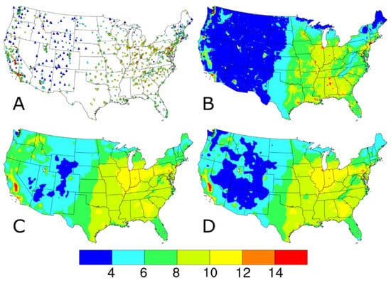 In recent years, the United States Environmental Protection Agency (EPA) has used a Bayesian spatial downscaling fusion model called the Downscaler (DS) model [] to create air quality surfaces of 24-h average PM2.5 concentrations of the contiguous U.S. for use in the draft Policy Assessment of the National Ambient Air Quality Standards (NAAQS) for Particulate Matter [] and the Centers for Disease Control and Prevention’s (CDC) National Environmental Public Health Tracking Network []. The DS model also has the potential to be utilized in other air quality applications, including data fusion for EPA’s AirNow or citizen scientists using low-cost sensors to monitor pollution levels in their region.
