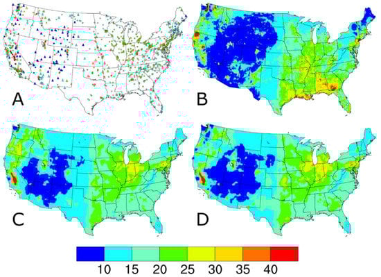 In 2014, the IMPROVE network [,] consisted of 153 sites located in remote areas, like National Parks and Wilderness Areas mostly in the western U.S. (hereafter defined as the region with a longitude west of 100° W containing 98 IMPROVE sites). IMPROVE sites measure concentrations of PM2.5 mass and concentrations of PM2.5 chemical components on the same 1-in-3-day schedule throughout the U.S. Although PM2.5 mass concentrations are measured at IMPROVE sites using a filter-based method similar to an FRM, it is not considered regulatory quality []. The IMPROVE input datasets were summarized by annual means (triangles, Figure 1A) and 98th percentile values (triangles, Figure 2A). The IMPROVE sites fill in the spatial gaps in many of these Intermountain West areas.
