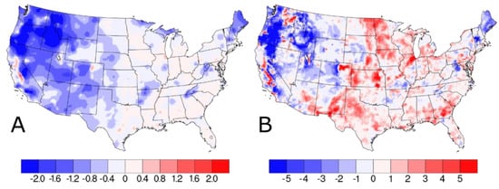 Difference in (A) annual average and (B) 98th percentile PM2.5 concentrations (in units of μg m−3) on IMPROVE sample dates as predicted by Downscaler when the IMPROVE data are included.