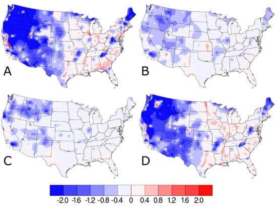 Difference in (A) Q1 (January, February, March), (B) Q2 (April, May, June), (C) Q3 (July. August, September), and (D) Q4 (October, November, December) quarterly average PM2.5 concentrations (in units of μg m−3) on IMPROVE sample dates as predicted by Downscaler when the IMPROVE data are included.