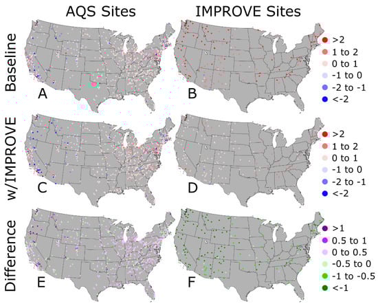 For the IMPROVE sites, Figure 5B shows that the baseline DS model run almost universally overpredicts concentrations with many sites having a mean bias >2 μg m−3. Overpredictions at the IMPROVE sites are also common in the w/IMPROVE DS model run (Figure 5D), but most sites have a mean bias within ±1 μg m−3. The absolute mean bias difference in Figure 5F shows that nearly all predictions in the w/IMPROVE DS model run were better than that of the baseline, often by more than 1 μg m−3. Of the few IMPROVE sites with degraded predictions in the w/IMPROVE DS model run, most were clustered near AQS sites whose concentrations are underpredicted in both DS model runs.