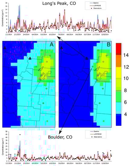 Denver, Colorado-area annual average PM2.5 concentrations on IMPROVE sample dates that were (A) predicted by Downscaler with the baseline configuration and (B) predicted by Downscaler with IMPROVE data superimposed with annual averages observed at the AQS (circles) and IMPROVE (triangles) sites. The time series charts give the 24-h average PM2.5 concentrations observed and predicted at Long’s Peak and Boulder, CO.