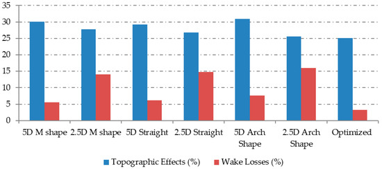 For the five turbines that have been optimized in the site, the arrangement of the turbines facing the main wind direction, with five times the rotor diameter distance between each turbine, resulted in 22.75, 22.87 and 21.997 GWh/a for the M shape, Straight line and Arch shape, respectively. Reducing the distance between THE turbines to 2.5 times the rotor diameter decreased the wind farm energy yield to 22.68, 21.498 and 21.5463 GWh/a for the M shape, Straight line and Arch shape, respectively. It can be concluded that an optimized arrangement allows a significant increase in power generation while consequently reducing the costs of the wind farm.