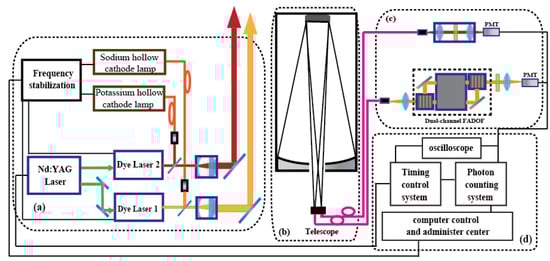 Schematic diagram of diurnal sodium fluorescence lidar system (dual-wavelength lidar detection system). A lidar system is composed of (a) a laser emission system, (b) a signal receiving system, (c) a signal detection system, and (d) a data acquisition and timely sequence control system.